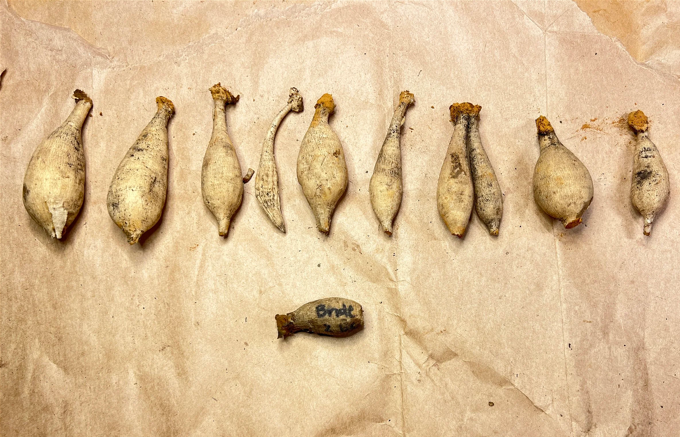Our dahlia tubers are guaranteed to have a body, crown, and eye, and will be at least the size of an AA battery. While it may seem that bigger tubers are better, that's not always true. As shown in the image, a small tuber (1.5" long by 1" wide) produced 10 larger tubers. Plant strength and productivity are not determined by tuber size.
